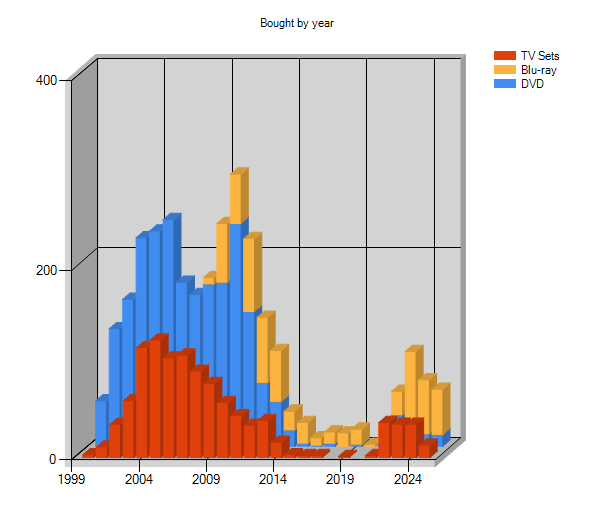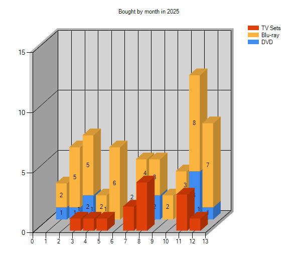 While I certainly averaged more than one per month, I did reduce the total purchased. I don't have DVD Profiler open right now to look, but I think I bought less than 150 this year (maybe even close to 100(, down from over 200 the previous years.